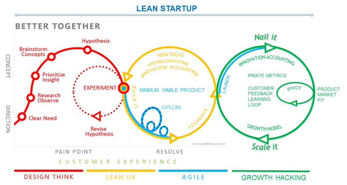 - Lean Startup (w Designing Thinking, LeanUX, Agile, and Growth Hacking)
